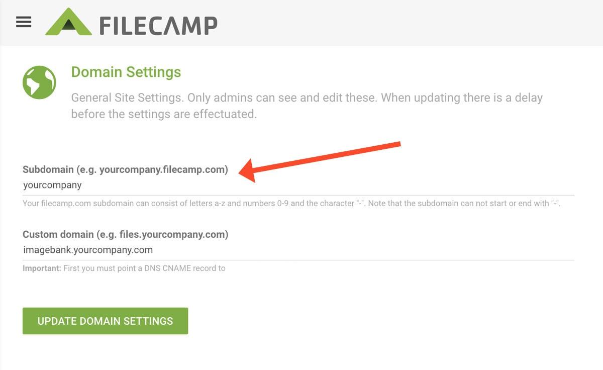 Change your Filecamp subdomain or use a custom domain name with your Filecamp