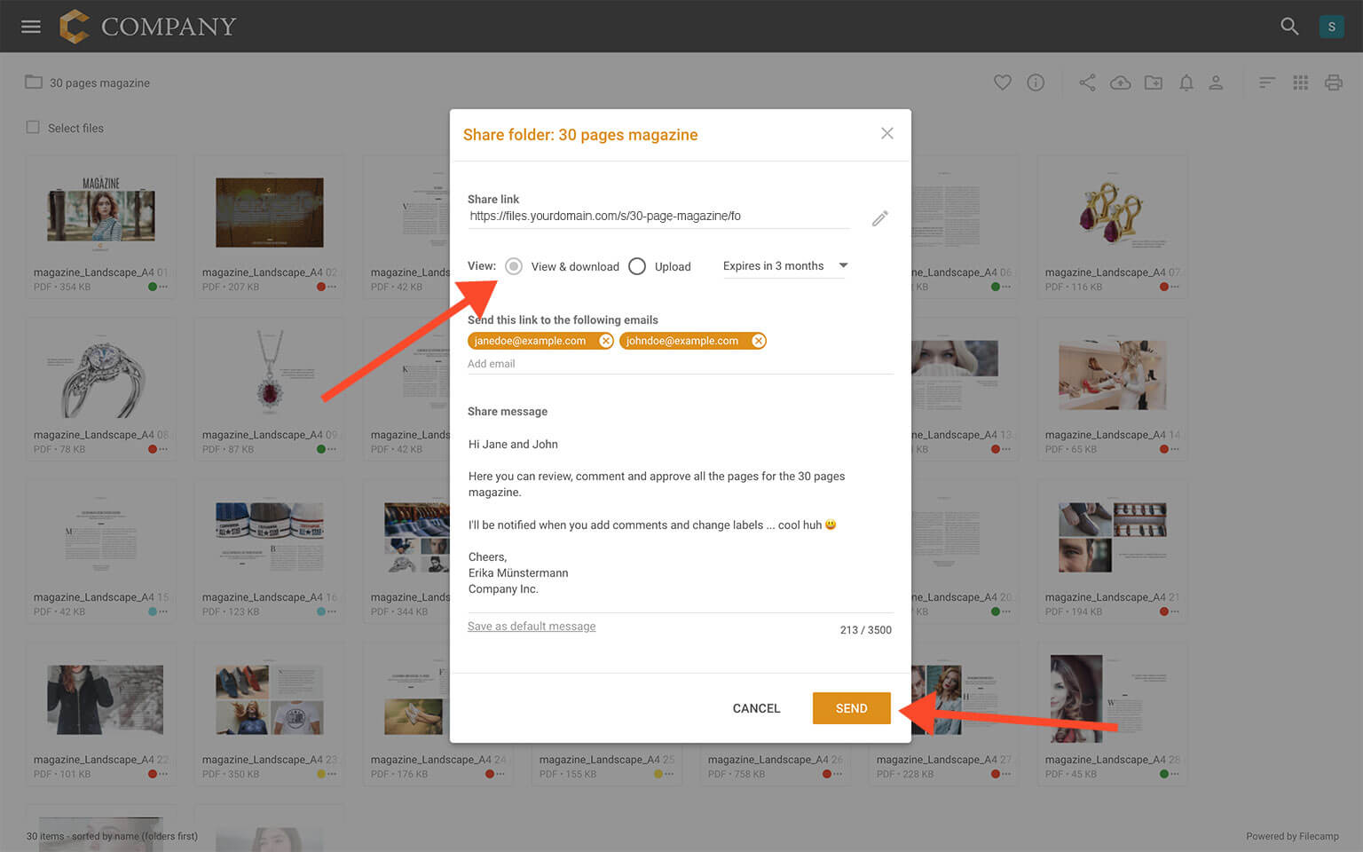 Make sure you have selected the View & Download checkbox in the Share folder pop-up window. Enter the email addresses of your reviewers, set an expiration date for the link, and write a short message that will be included in the email. Read more about Share folder links.